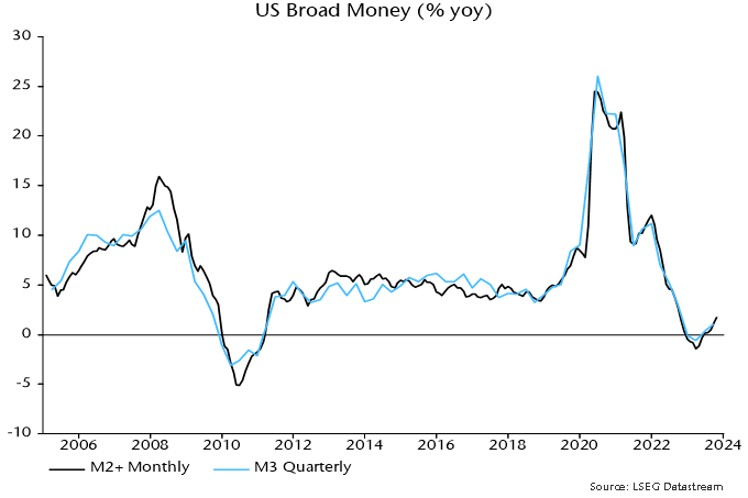 The rise in equity purchases followed strong growth of non-financial business broad money holdings in the year to end-Q3, discussed in a previous post. Such holdings, however, contracted slightly in Q4, pulling annual growth down from 10.6% to 6.2% – chart 2.